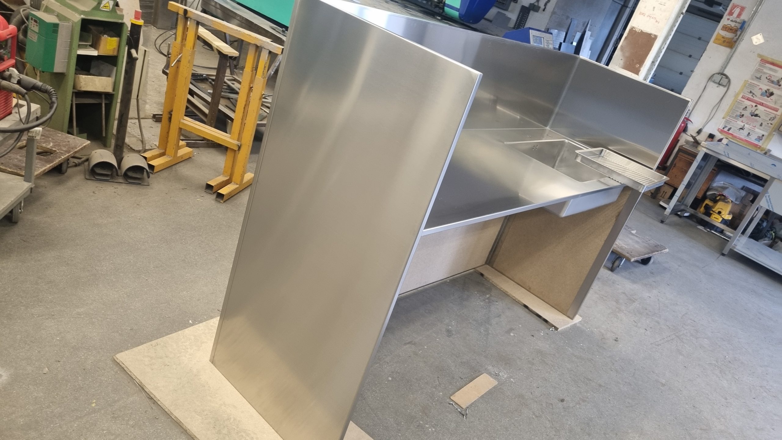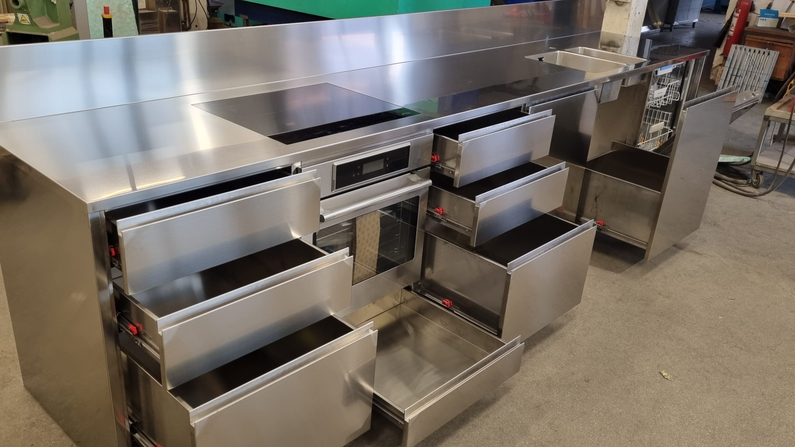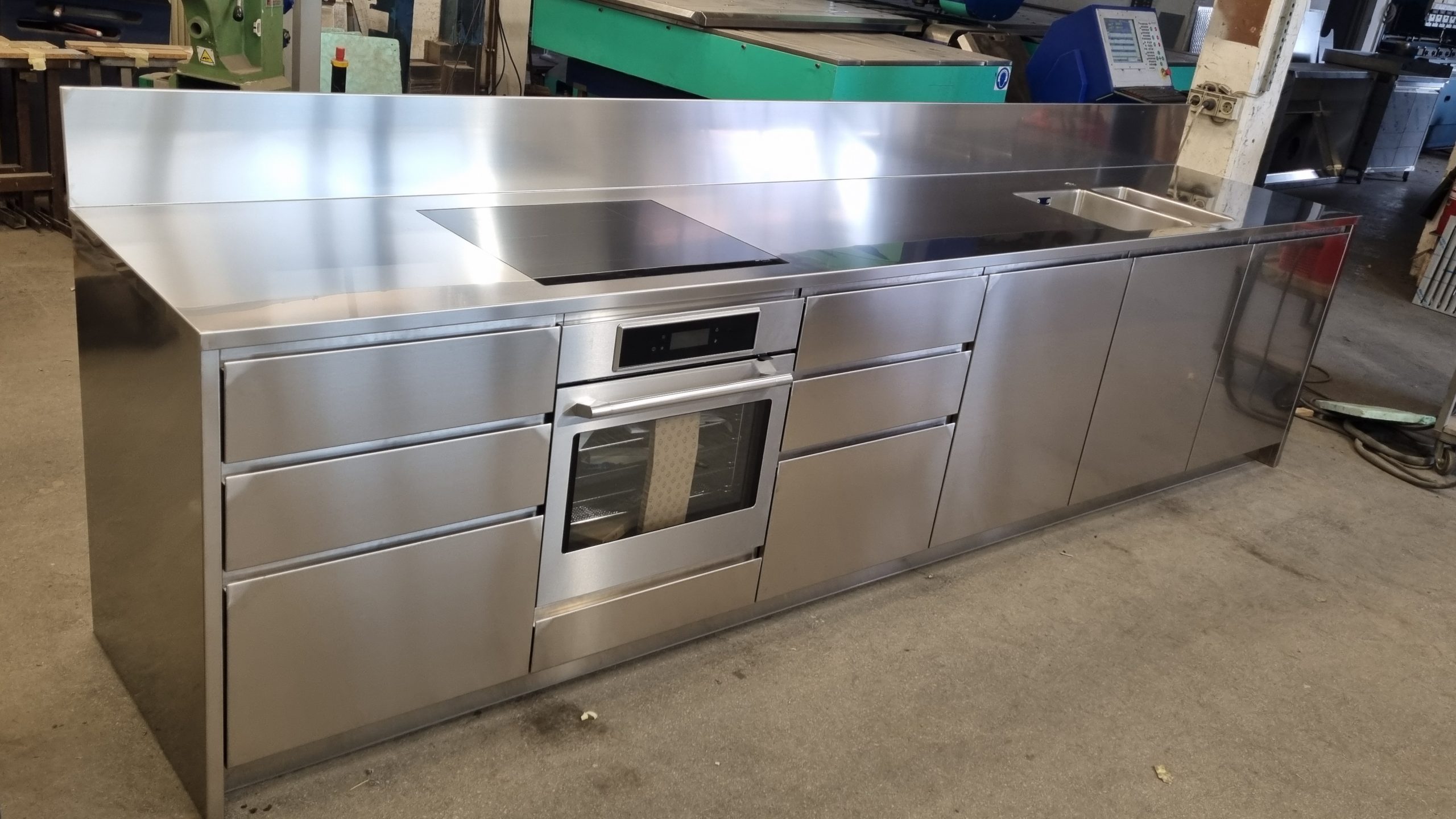 Možemo izraditi kuhinju za kućanstvo od nehrđajućeg čelika . Ploča od nehrđajućeg čelika sa sudoperom , ugradbenom pećnicom , pločom za kuhanje , perilicom posuđa i hladnjakom .